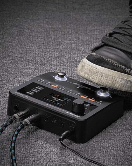 右スイッチを長押しすることで、特定のパッチ内で複数のエフェクトを一括ON/OFFできるScene(シーン)モードが発動します。例えば「ソロ時に歪みブーストとディレイを同時にかける」といった操作がワンアクションで可能になります。 さらに、外部のデュアルフットスイッチを接続すれば、本体をストンプモードに固定しつつ、外部スイッチでパッチを切り替えるという、大型マルチ並みのハイブリッドシステムを構築できるのも隠れた魅力です。