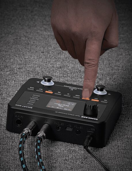 SMART BOXは、この問題を9つのエフェクトブロック専用ボタンで鮮やかに解決しました。 本体上部に並んだ「Drive」「Amp」「Delay」といったボタンが、そのまま各エフェクトへのショートカットになります。調整したいブロックのボタンを押せば、即座にそのパラメーターが画面に展開されます。この「ボタン一発アクセス」により、説明書を読み込まずとも直感的に音を作り込めるUIは、他社製品を一歩リードする使い心地です。
